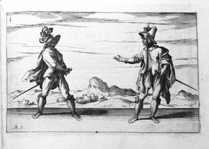 Because customs are not the same in all lands, and often times enmities are expressed with little sincerity, in order to be provided against all occasions, it will not, perhaps, be out of place to teach the way of laying the hand on the sword, before we come to deal with its handling. Therefore, if by chance you have your right leg forward when laying your hand on the sword, as one of these figures shows, you will draw back the said leg, extending your right arm at the same time into high prima; and if perchance you find yourself with the left leg forward, as the other figure shows, it will not happen if you do not draw your sword in the aforesaid manner, without changing your pace; and if you should wish to avail yourself of the sword and cape, or sword and dagger, as well as the single sword, the true way is, that first you will take a step forward with your right foot in order to present yourself in quarta, or alternately, the adversary being near you, you will draw your left foot back, presenting yourself as above, and then at your ease you will be able to wind your cape or extend your hand to your dagger with more safety, being that the point of your sword will make it such that your adversary remains distant while you accommodate yourself to your weapons; and this is as much as it occurs to me to say about this particular topic.