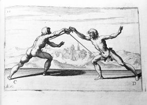 Figure D having gained the sword of figure C, the same figure C turning a riverso to the face of the figure marked D, D strikes him in the turn of the riverso in quarta raising well the arm, and at the ending of the sword's motion increasing well the pace, in the chest under the sword arm as you see. But I say, that if C, instead of turning the riverso, had disengaged the sword back, retiring somewhat, a lifting the sword in an oblique line, so your point regards the left side of the Adversary, and D wishing to enter in quarta C parrying with a half-mandritto, would give him a riverso to the face,or a thrust to the chest.