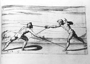 The sword of the figure C being gained by the figure D, this same figure C turns a riverso to the leg of the figure marked as D. D is able to strike him during the turning of the riverso, with a stramazzone to the arm or a thrust to the face, as a consequence of his leaning too far forward; as the figure shows, the said figure D moreover draws his right leg back during the attack. Always, I say, that when D was stringering the sword of C, had C been a shrewd person, he would have given a riverso to the face followed by a mandritto fendente to the head and thus he would have been safer.