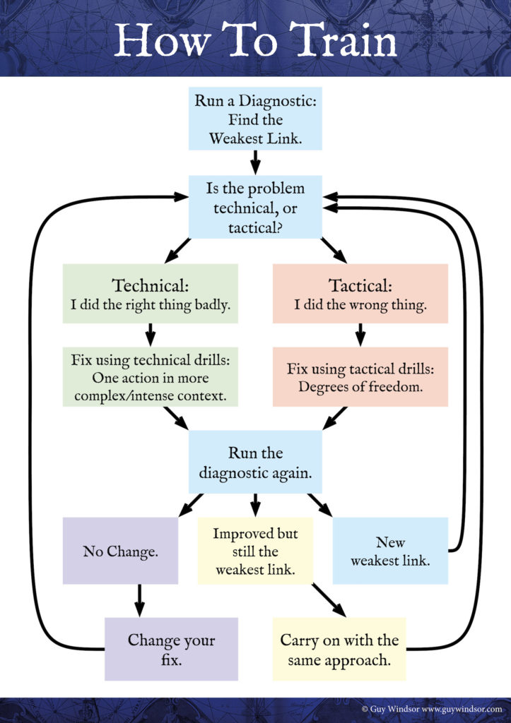 Run a diagnostic: train at the level where something goes wrong, then figure out what that something is. Is it technical, or tactical? Tactical problems are all about knowing the right thing to do, and technical problems are all about doing the right thing well enough for it to work. Most of the more complex training set-ups can go wrong at either point, so it’s a good idea to have a clear idea of what kind of problem you are working on, and you should be able to identify the type of problem before you rush off to fix it.