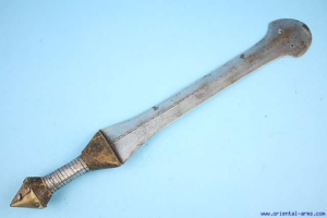DS: Yeah, not so much in the fighting. I don’t really blame them for that, but definitely in the weapons, they use quite a few short swords and knives that were inspired by Central African weapons. Of course, the spear and shield that T’Challa is fighting with is typical Nguni Zulu shield and Iklwa. But the Killmonger’s sword looks like a blend between a Ilwoon-style sword from Central Africa, from the Kuba and Luba people in Central Africa. It looks like a blend between an Ilwoon, with that spatula shaped tip, and there’s another sword I believe is, (Central Africa as far as its weapons is not my strong point,) but I believe it’s the Tetela sword, Tetela knives they have that that that spatula shape or rounded tip into their swords. And it was really reminiscent of that. Other than that, I think the Dora Milaje, their spearheads look like some of the Central African spearheads that I’ve seen. The border tribe, they use the sickle swords that were pretty much like Mambeles.