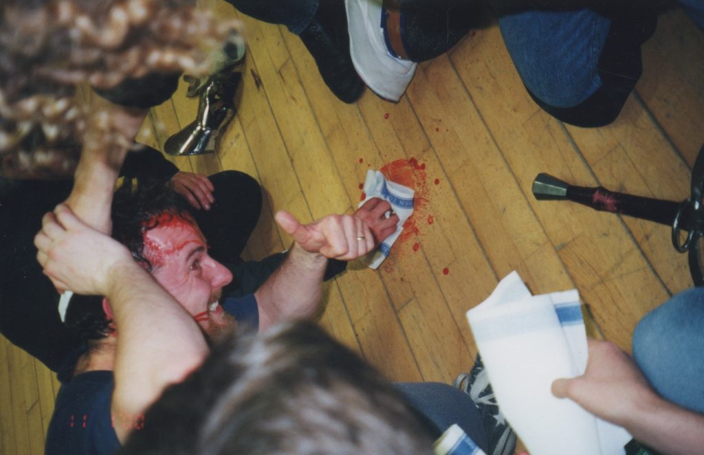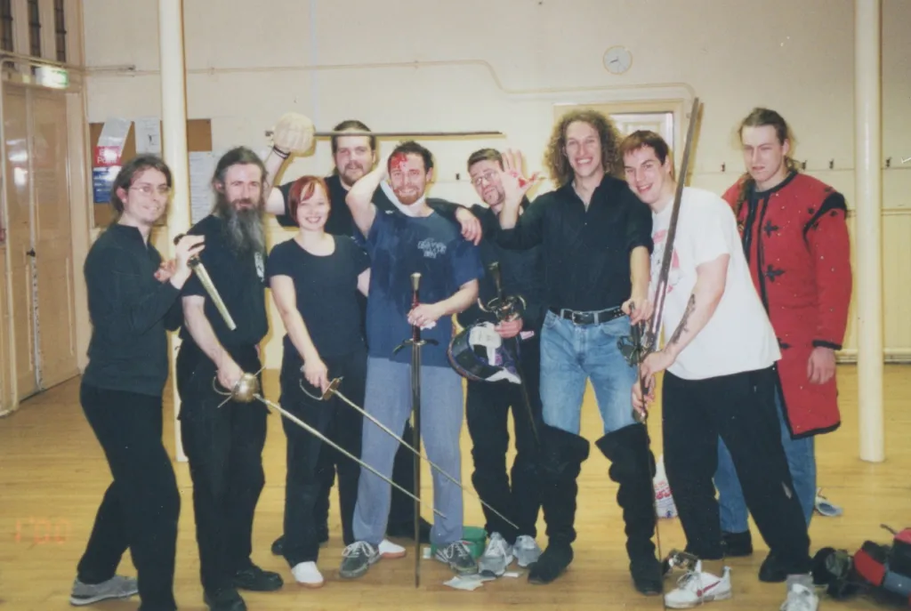 GW: And in that process, I have a photograph of all the people who I fought that day, and there’s about 12 of them. And the last one, a guy called Kieran, who he was tired for some reason, I think he had a night shift the night before or something like that. And he was not really in a fit condition to fight. And he said so. He said so. I, being a fool, persuaded him to fence me anyway. And we were fencing with longswords, with the standard protection at the time, which was like an ordinary fencing mask and steel gauntlets and a padded gambeson. I threw a sword at his head. Not literally. He got out of the way, and bang, hit me in the head. But he was really tired and he was under some pressure and he did it instinctively, and it caved in the back of my fencing mask and split my scalp. And I had blood pouring down my face. I think it was Rosie, somebody there was taking photographs of it and we actually have a photograph of the moment he hit me. And of course, after photos and a photograph of me like holding my head and blood pouring down my face with everyone else who had fenced me that day, all in the same photo. That was great. And then, it gets better. Obviously, head injury. I couldn’t drive. I had driven to practise and my girlfriend at the time didn’t have a driving licence, so that just stayed where it was. And so my friend Paul drove me to the hospital, right? At the hospital, head injury, straight to front of the queue because they’re careful about these things. And of course, it’s a sword. A whole bunch of like student doctors who start coming to see an actual sword injury. And as it was, it was just a split scalp and three staples out the staple gun and a card saying, if you find this person, bring him straight to the hospital or whatever. So like, if you start to get dizzy, you can wave it at a taxi and they’ll take you to the hospital. They take these things very seriously. In the hospital, we weren’t there for very long. Then we thought, okay, I can’t drive, so we might as well go to the pub.