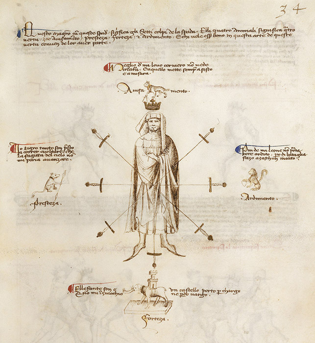 GW: Because if you add in all the crowns and collars on the animals, you get, I think, 12 pieces of gold. There’s the sword hilts and there’s the crowds and stuff. There’s all sorts of things. When you look at the version of the Getty manuscript, at least, all the numbers he’s used so far, like the eight things you must know for the abrazare, and the five things for the dagger and the nine masters of the dagger and the 12 guards of the long sword and the seventh plays of the sword. You can use the various elements of the Segno like a memory palace to hold those groups together.