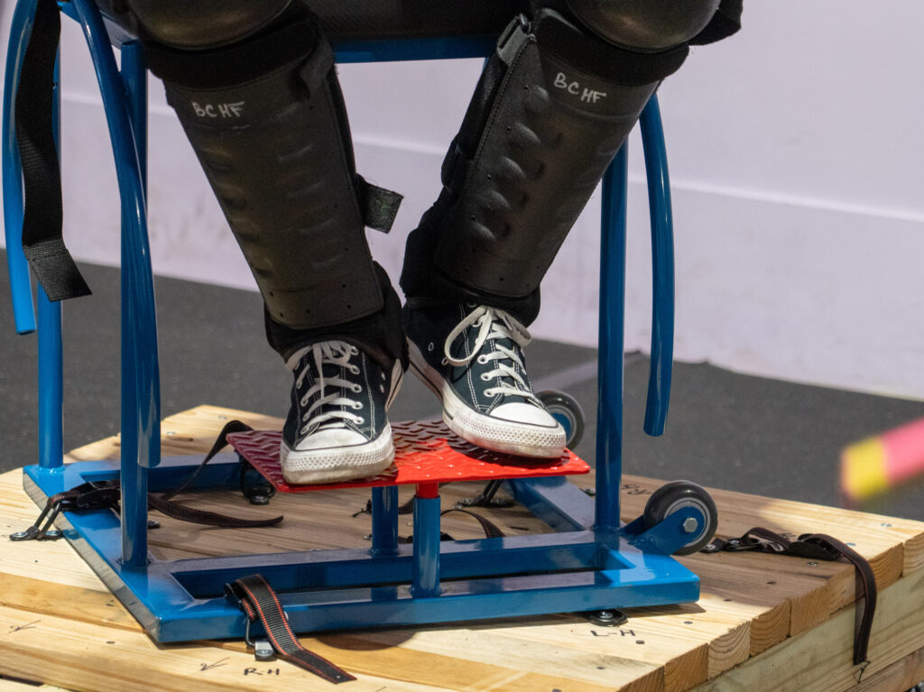 So we had to come up with a solution to allow a seated fencer to fence a standing fencer and make it fair. What we ended up doing is we made wooden platforms that were extremely heavy so there would be no rocking, and they’re about a foot off the ground. We mounted the chairs onto those and put the platforms on wheels that can come up and down, that way they can be moved and then lowered. That fixed the stability issue, and it got the chairs high enough off the ground that when you’re sitting in them you’re at about the height of an average-sized person. You’re about 5’8″, 5’9″.