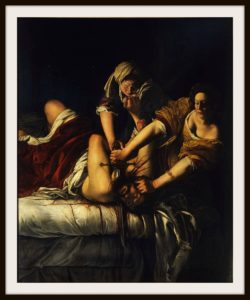 CM: Yeah, exactly. It’s so interesting and it’s really interesting to see how there’s lots of different conflicting versions, like some interpretations will definitely say, oh, well, she definitely did that. And then others will try and erase it altogether. And it’s really interesting to see different depictions of Judith. One is as a fully armoured symbol of virtue and she’s slaying Holofernes like a hero, like a kind of Joan of Arc figure. And in others, she’s very, very seductively dressed and she’s kind of seductively holding that sword.