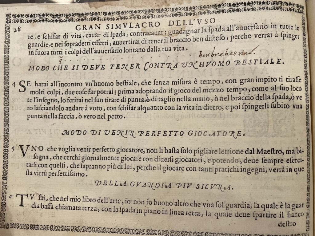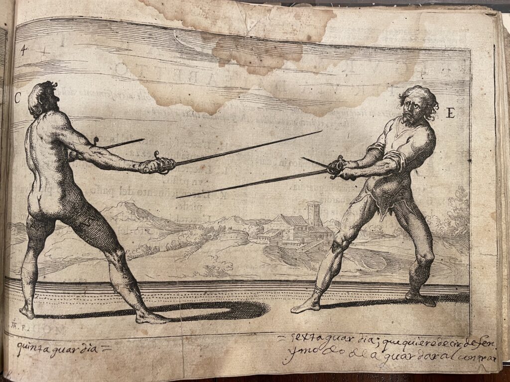 Meanwhile, even in sport fencing worlds, which I know very little about, I’d be in conversations they would know Capoferro and maybe not his contemporaries. So that just kept driving me to want to get a translation done. So I started when I was in university going to the Italian master’s thesis students, and saying, not only would this be an amazing thesis, I’ll pay you. I mean, I didn’t have much money. So maybe it was like 50 bucks or something. But I was like, I’ll give you something to do this as your project. And I had meetings with four or five different people, because they thought it was a great idea. Then they looked at the text, and went, oh, no. And I was like, what? And that’s when I realised, I wasn’t asking them to translate Italian. I was asking them to translate Shakespearean Italian. It is written the way Shakespeare is written. It’s that time period.