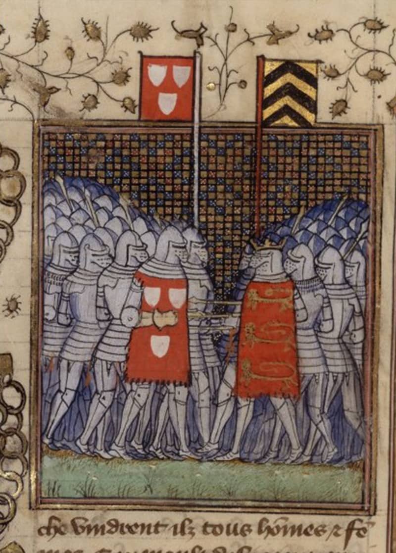 One of the few contemporary images of Geoffroi de Charny, the knight in a tabard on the left.