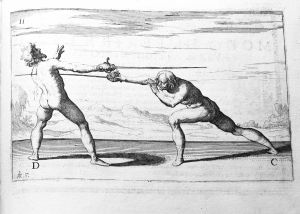 First in terza, you place yourself in a high transverse quarta, so that the point of your sword corresponds to the left shoulder of the Adversary, and he coming to cover yours in an oblique line, you in his coming will turn the hand in seconda, with the lean, and lowering the body, will strike in contratempo in the waist under his sword as the figure shows. Second, in the case that the adversary has you constrained on the outside, you turning a thrust to feint in quarta to the face, and he wishing to parry, you turning the hand with the same leaning, you will strike under the sword, as above. Third, when you have been constrained to the inside, you could disengage a feint thrust in terza to the face, and him lifting the sword to parry, you would strike under the sword, turning the hand in seconda, in the manner as above. Fourth, you having your Adversary constrained on the inside, and he coming to strike you with a thrust to the face, you could strike him in two ways, first you could strike in contratempo in his coming,lowering your waist, and the sword in terza, and also you could strike parrying in terza with the point high, turning the hand in seconda in the strike, in the way, that is above. Fifth, and finally, you have the Adversary constrained to the outside, and he disengages to constrain your sword on the inside in the same tempo, turning the hand with the lowering, and leaning the body, you would strike in terza under the sword in the same way, that is above."